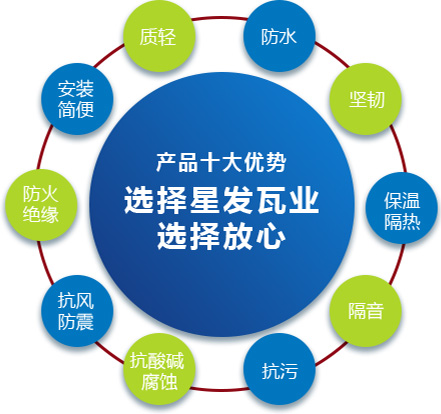 公司主要產(chǎn)品有《星發(fā)牌》合成樹脂瓦、APVC防腐耐候復合瓦、APVC發(fā)泡隔熱瓦、PVC半透明瓦、PVC防腐隔熱瓦、PVC防腐瓦、PVC防腐平板、PVC條紋板和ASA/PVC超耐候復合瓦等產(chǎn)品。產(chǎn)品一經(jīng)推出,已被廣泛應(yīng)用于國內(nèi)各類平改坡項目和大型工業(yè)項目,遠銷歐洲、亞洲、美洲和非洲等國外市場,還獲選為廣州亞運會、深圳大運會、四川災(zāi)后重建等工程項目的應(yīng)用產(chǎn)品。公司在不斷創(chuàng)新和改革的基礎(chǔ)上,力求以更好的產(chǎn)品、優(yōu)良的服務(wù),用心、專心服務(wù)好每一個客戶。
